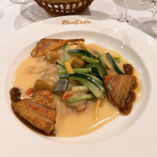 ルージェのポワレ。ルージェはヒメジという魚で、ソースは3種類かかり台湾で食べた帆立ソースのような味とクリーム、エスニックのような。皮がパリパリの魚にソースが本当にどうなってるのか、、味わい深い。。
