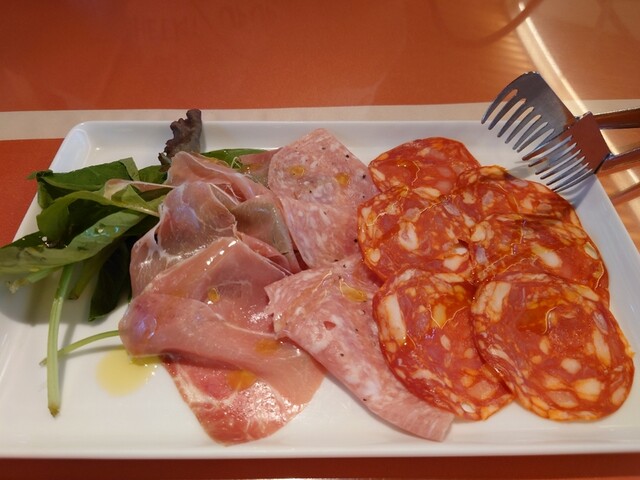 生ハムと2種サラミ、やわらかくてしっとりしておいしいです。新鮮なルッコラが添えられて。個人的には真ん中のサラミがオイリーで美味しかったです!