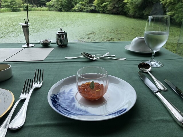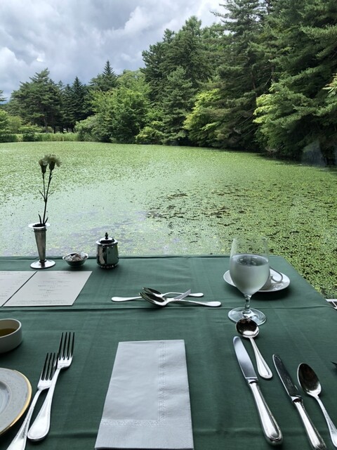 青空の中の新緑、池に広がる水草、テーブルクロスの緑が見事にマッチして、特別な景観を生み出しています。席から見え...