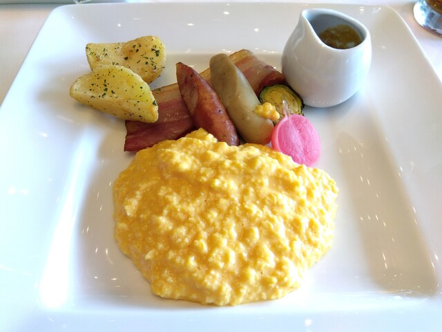 「スクランブルエッグ トリュフ入りデミグラスソース サイドミート 温野菜」