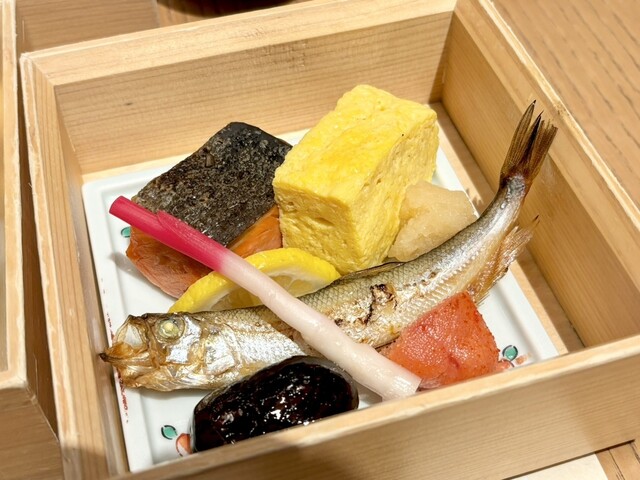 1段目がおかずで、シシャモ、鮭、厚焼き玉子、明太子、黒豆、
