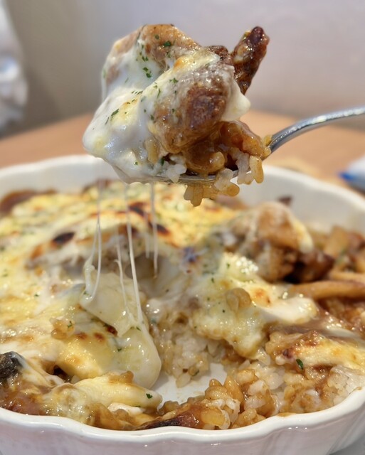 「ケイジャン風」と銘打っているだけあり下味がしっかりついた信州福味鶏を香ばしく焼き上げてからカレー風味のドリアにトッピング!