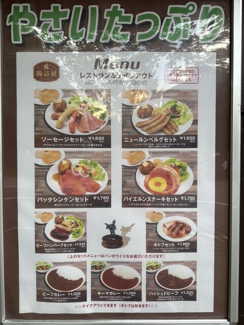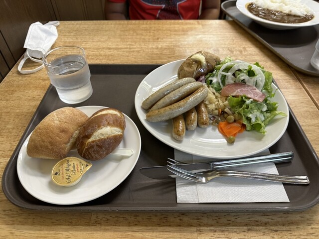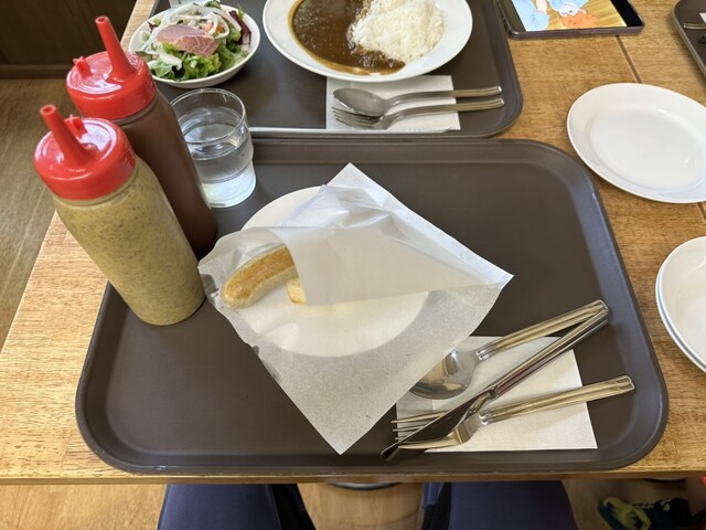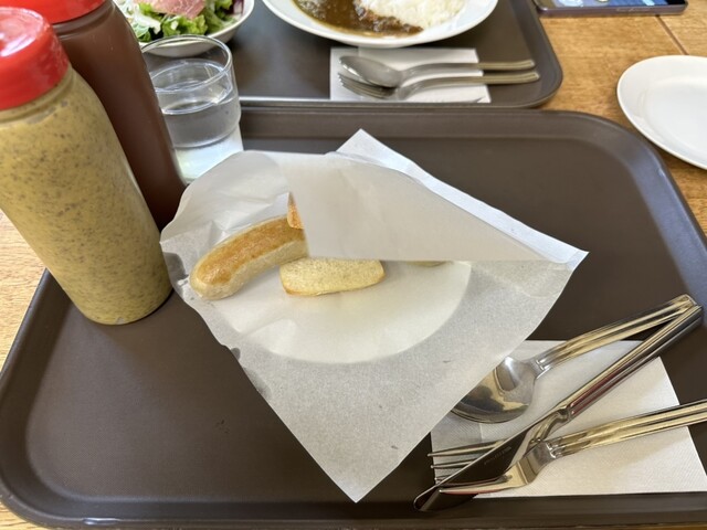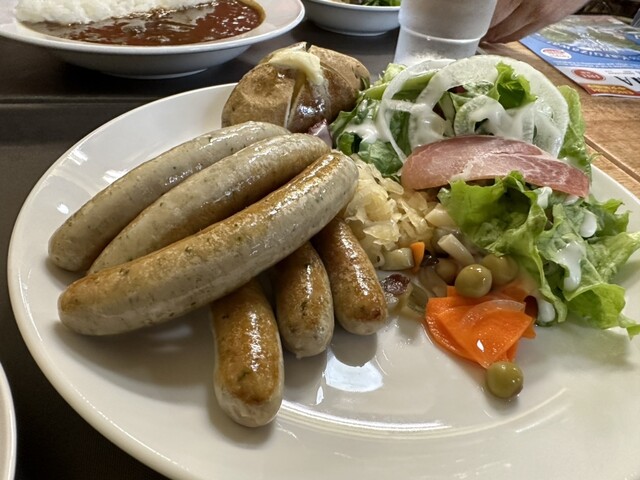 メニューは、軽食にホットドッグ、カレーライス、ハッシュドビーフがあり、それに加えて、ソーセージのプレート料理です。