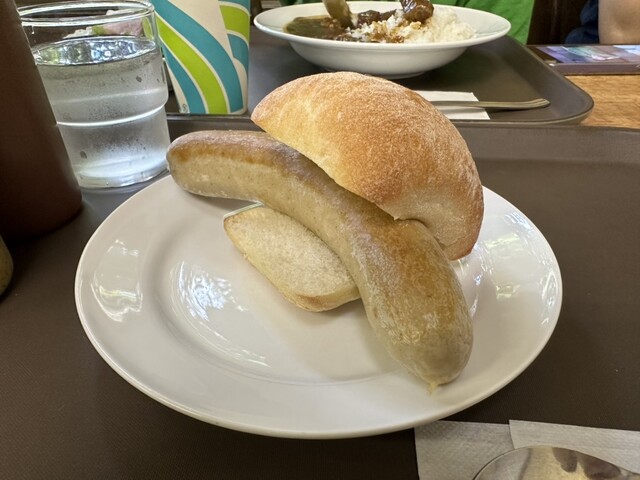 …こんな形のホットドッグは初めてみました。ホットドッグと言えば、細長いホットドッグバンズでウインナーソーセージを挟む物と認識していましたが、こちらのホットドッグは丸い食事パンで長いソーセージを挟んだもので、ソーセージがそれこそ半分以上パンからハミ出してます。