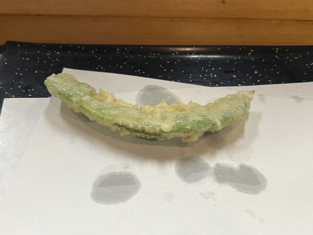 野菜天3種が続き海老のかき揚げ。食事を選択する必要があるのだが、私が選んだのが天丼。