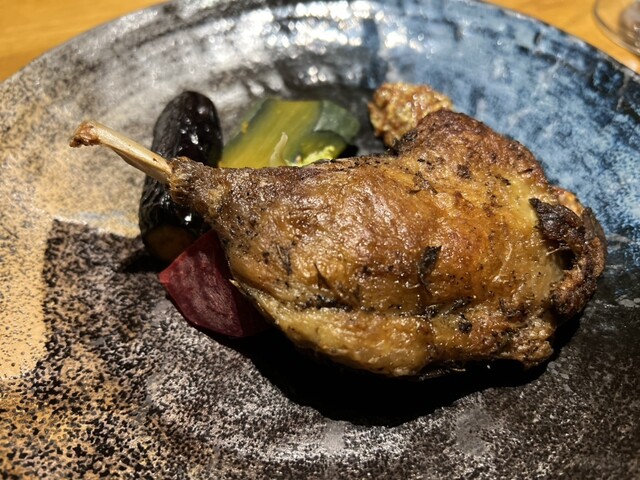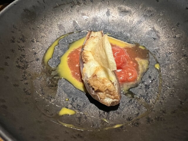 季節野菜のロースト。この日は秋茄子をトマトペーストに乗せ、地卵のソースがかかっております。