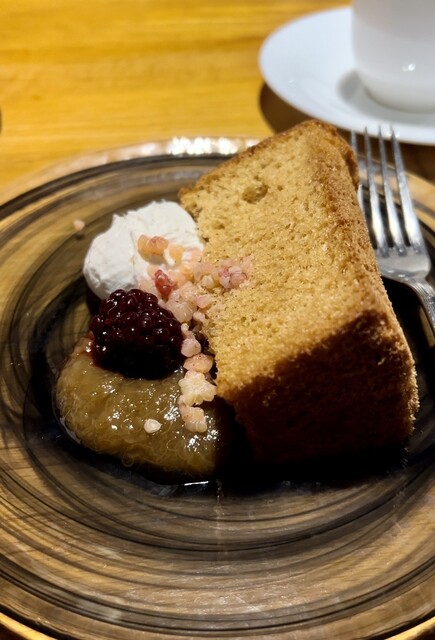 玉ねぎのシフォンケーキ。甘さ控えめですが付け合わせの豆乳のクリームとルバーブのジャムでやられます。美味しい!