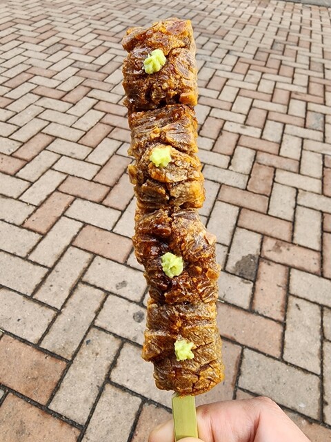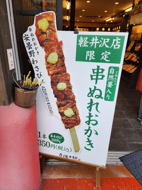 国内産もち米を100%使用した自然薯入りのぬれおかき。各店舗で限定の味がある様で、こちらは安曇野わさび。串に刺した甘口醤油のぬれおかきの上に、わさびが乗っているもの。
