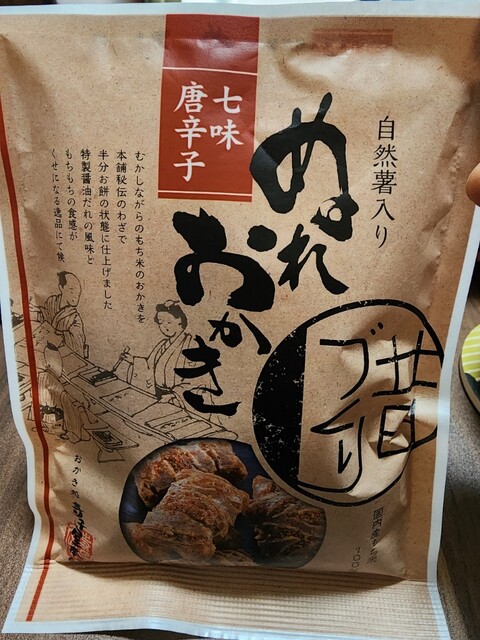 一瞬ツンと鼻に抜ける感じがあるがあるだけで、そんなに辛くない。甘口醤油の甘さに、もち米の焼けた香ばしさとわさびの清涼感で、めちゃくちゃ美味しい!!ぬれおかき特有のもっちり感も自然薯が入っているので粘り気があり、とても良い感じ。