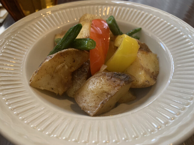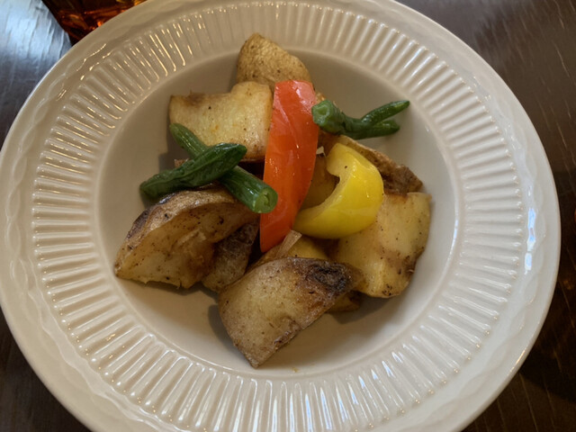 まず「ホームフライ」が運ばれてくる。…いい色に焼かれたジャガイモ、彩良い野菜の赤と黄色のパプリカ、緑のインゲン。