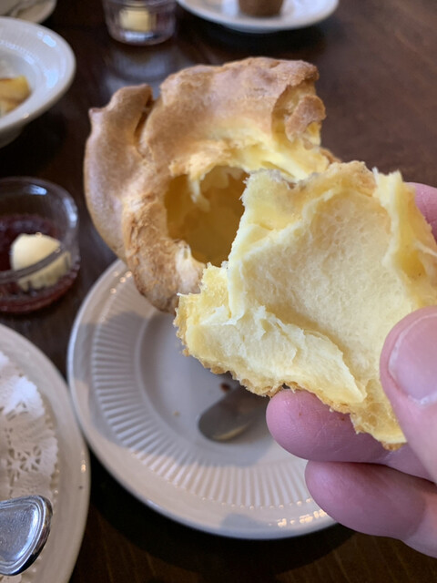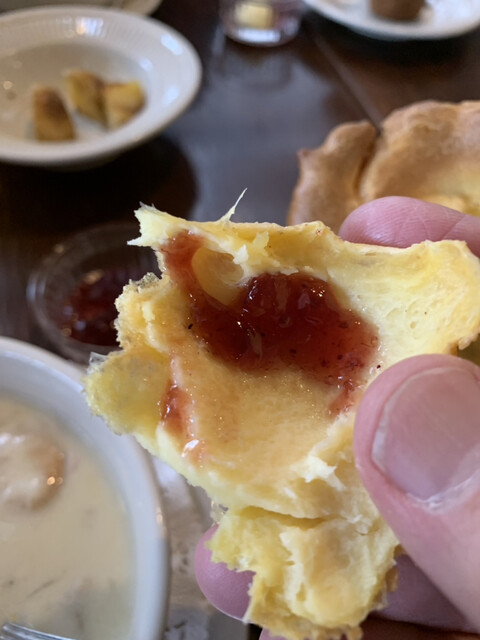 クラムチャウダーの少し後に焼きたてのポップオーバー(シュー皮のようなパン。アメリカ生まれの皮はサクッと、中はトロリと柔らか)が運ばれてくる。