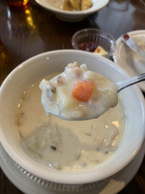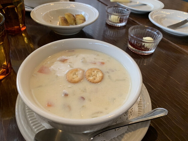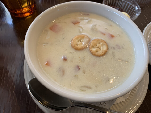 さらに5分後「クラムチャウダー」登場。…たっぷりのアサリと玉ねぎ、ベーコン少々、ジャガイモ、人参、そして前田のクラッカー2ケが何故か可愛く乗っている。美味しい味付けで、濃厚。食が進む。ボウルはかなり大きいと思っていたら、割と普通程度の大きさ。カップでは絶対に物足りなかった。美味しい事もあってペロリと飲んでしまった。