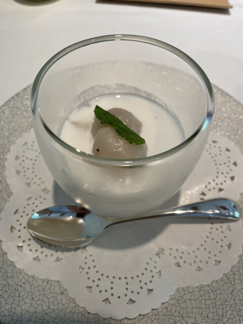 デザートのライチのパンナコッタはココナッツソースやフレッシュライチが新しく、それでいて完成された一皿でした。