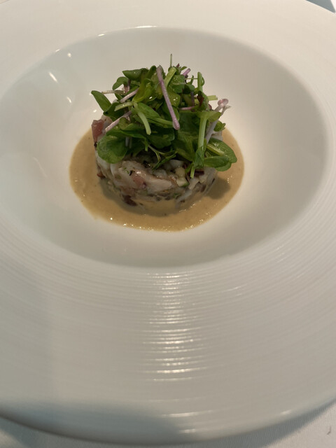 次に海鮮のタルタルはマグロやイカ、帆立などの海鮮がタルタルで調理され、茄子のソースが添えられていました。
