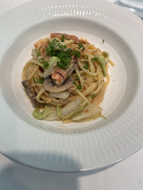 ホワイトアスパラの冷製スープ、海鮮のタルタル、甘エビのレモンクリームパスタ、鴨コンフィという内容でした。
