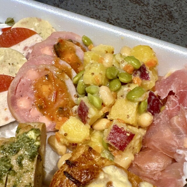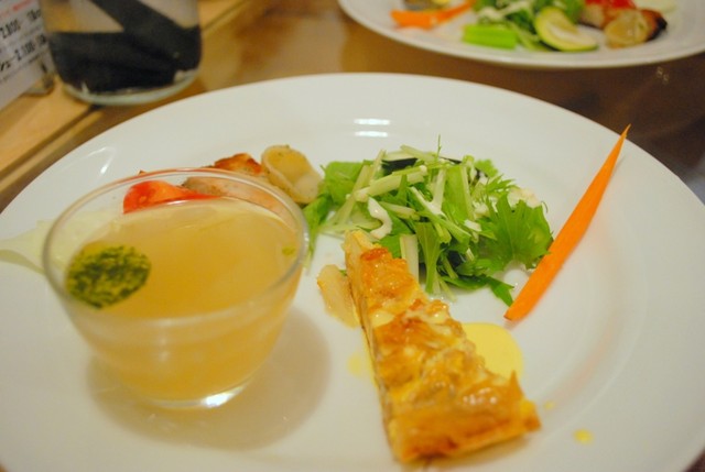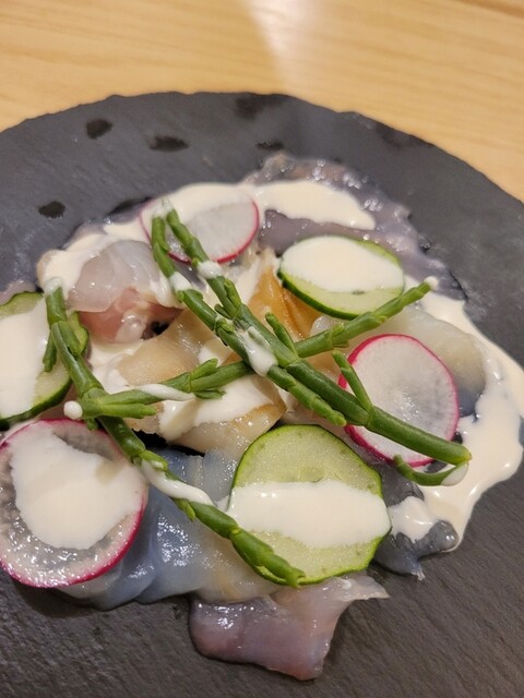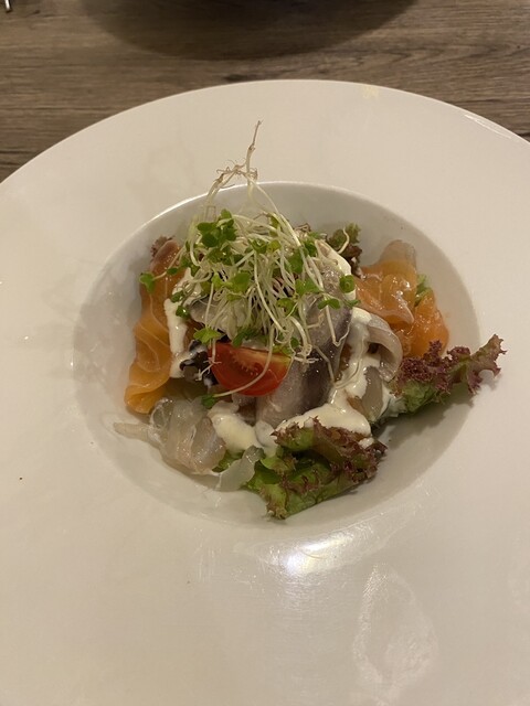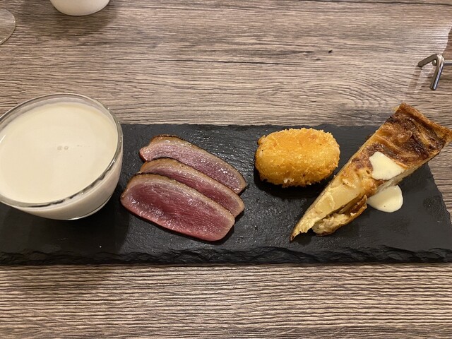 前菜も種類に凝っていて白いお皿には鱒と鰯の昆布じめのサラダ、黒いお皿にはかぼちゃスープとチリソースのお豆など凝っ...