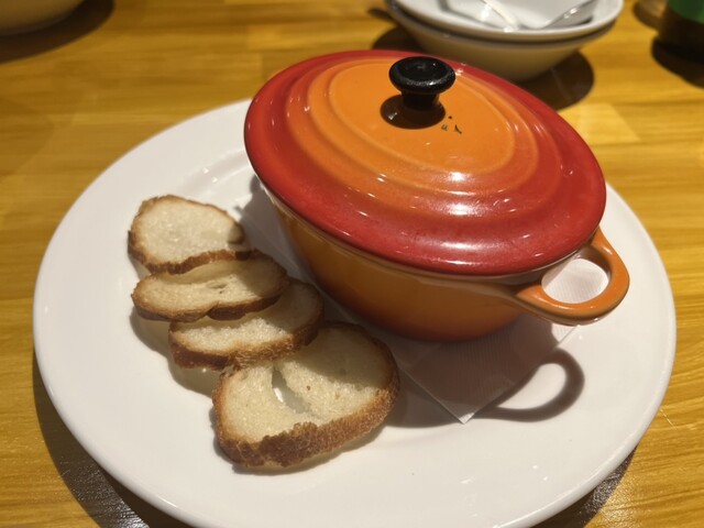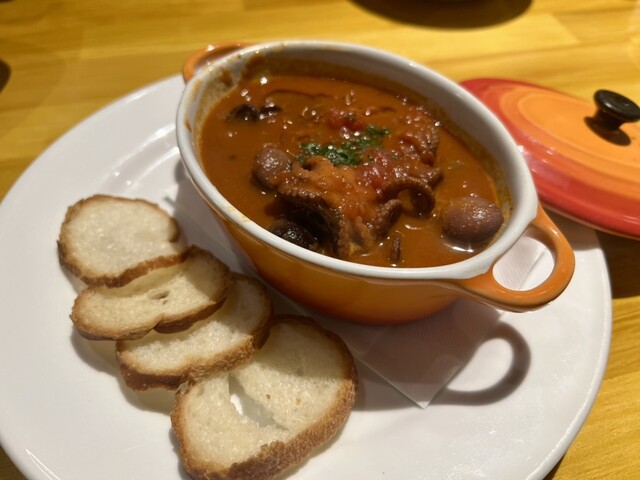 イイダコのトマト煮はココットが熱々で見た目にやられてしまう。イイダコは柔らかくトマトソースの味付けも濃くがあり、添えられたバゲットを浸して食べるとなおおいしい。