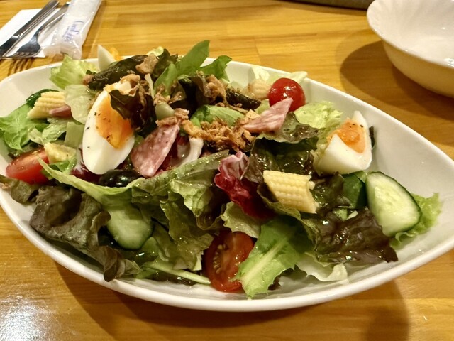 サザンアイランド風のドレッシングにカットトマト、何よりも細かく砕いたカシューナッツが散りばめて歯応えがあるのがいいアクセントとなっている。