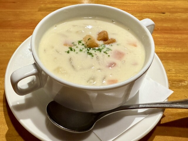 スープはまさに自家製で、たっぷりアサリが入っている。実に品の良いクラムチャウダー。