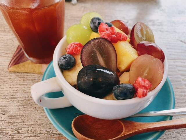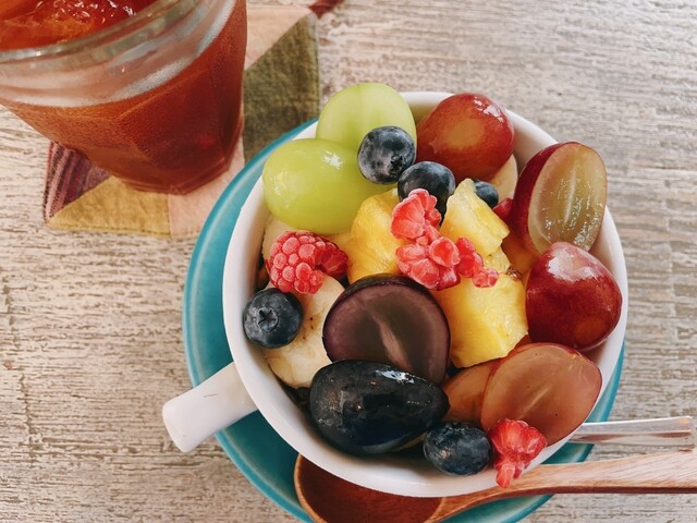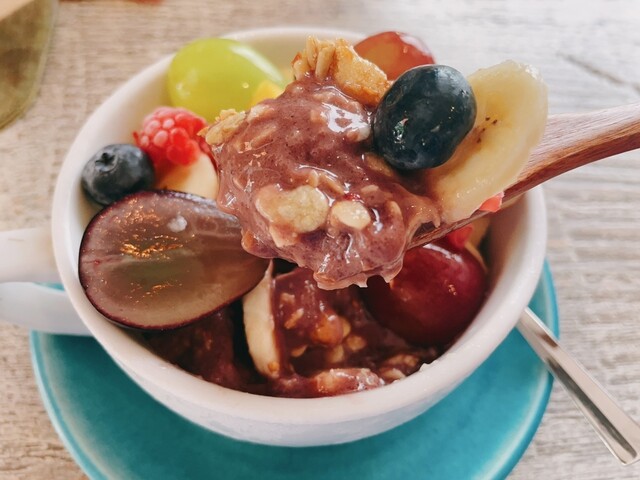 →アサイーとグラノーラ、アーモンドが入っていて上にはこれでもかというほどのフレッシュなフルーツ達が乗っています。ボリュームもあり満足感があります。