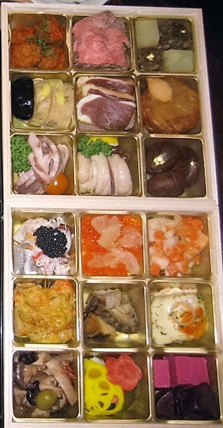 2段のお重は各段9個に小分けされ、色とりどりの食材が散りばめられています。