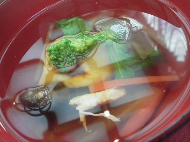 お雑煮には鶏肉、椎茸、大根と菜の花、人参が入っている上品なお味でございました。