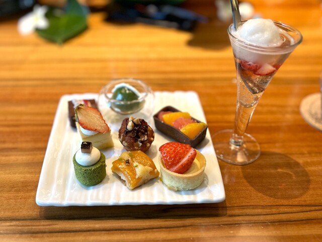 スイーツはフルーツ、チョコなどが使われた小さなものが多数用意され、好みのものを選べるようで、食べたいものを持って席に戻り、美味しくいただきました。