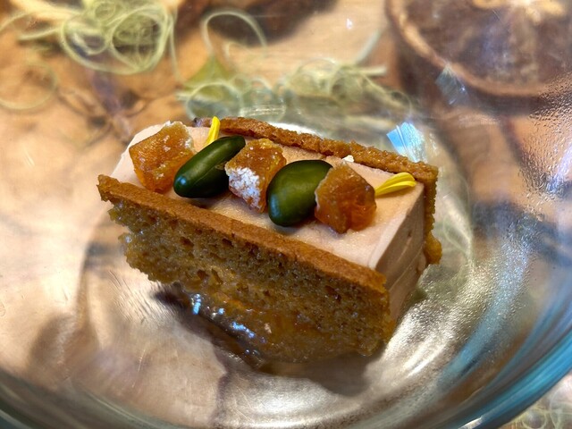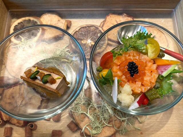 サーモンの上にキャビアがのった料理とフォアグラのテリーヌが届いたのですが、その運び方が今まで経験したことのない手の込んだもの。