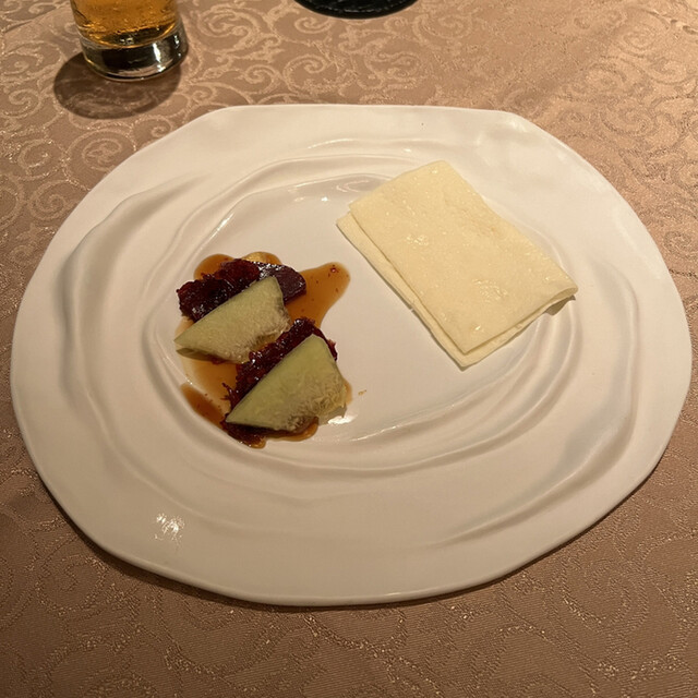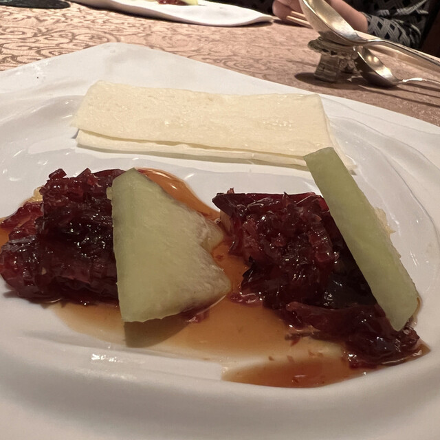蜜の甘さ+金華ハム自体の塩味と香りにメロンの甘さが溶け合い口の中で旨味が広がります。