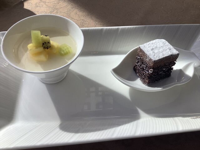 麒麟は「彩り前菜盛り合わせ」「ホタテ貝の強火蒸し フィッシュソイソース」「スープ」「オマール海老と春雨の大豆味噌煮込み」「肉料理」「お食事」「食後のデザート」のコース。