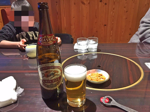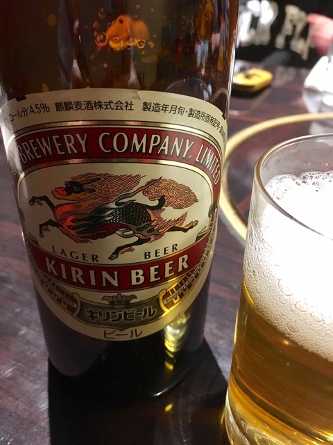 キリンラガークラシックです。おつまみに梅柿ピーが付いてきました。