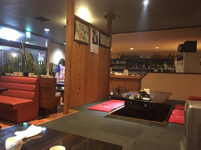 店内はソファのテーブル席と小上がりの掘りごたつ席があります。