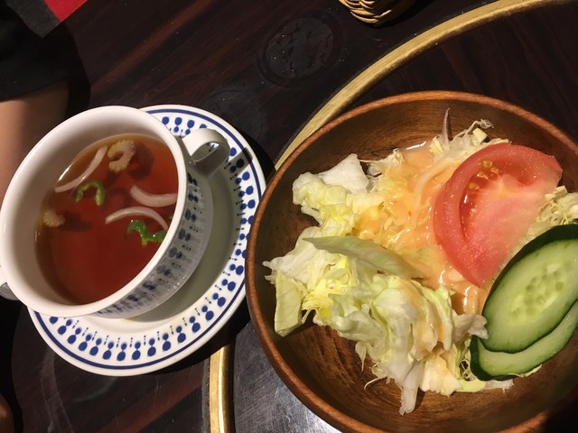 ビールから10分後、ビーフシチューセットのスープとサラダが出てきました。