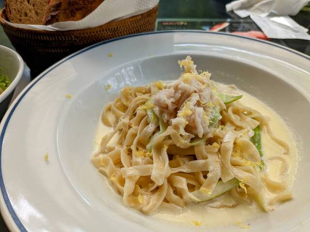 信州ハーブ鷄とアスパラのレモンクリームのパスタは意外とワイルドな濃厚な味でした。
