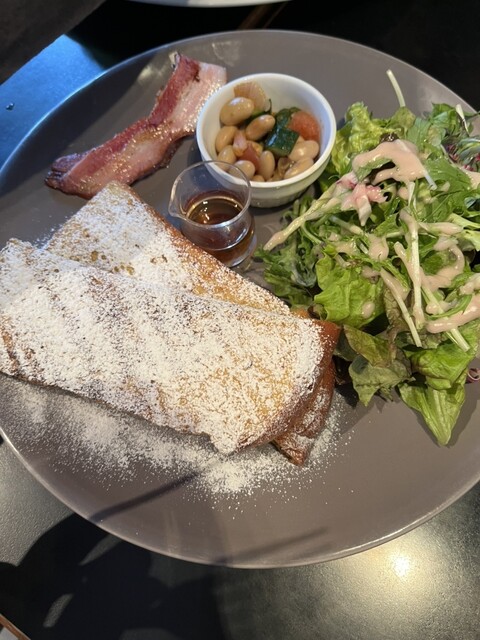 フレンチトースト、ベーコンが付いていて上からメープルをかけて食べるのですが甘じょっぱいお味が好きな方は絶対ハマる味かと思います!