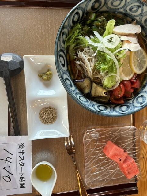 お客様とのゴルフ合宿一日目。灼熱のなかカラダを休めるメニューとして冷やし蕎麦をオーダーしました。付け合わせの柚子と胡麻を添えてさっぱり、涼やかに美味しくいただきました。ボリュームもちょうどいい感じ。ご...
