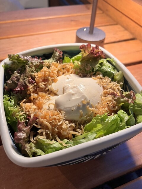 一押しは豆腐のサラダです。お豆腐は濃厚でクリーミー、上にのったじゃこと玉ねぎがアクセントになっていておいしい。ボリュームもあって大満足でした!