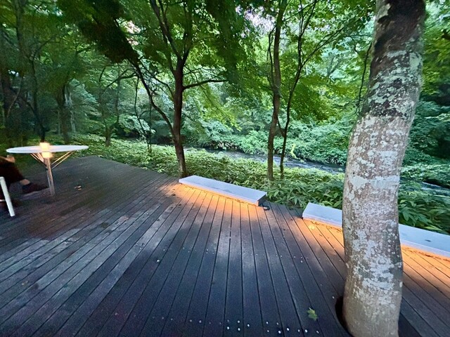 夕刻6時半の下界は真夏の30℃、ハルニレテラスの川沿いのオープンテラスは24℃