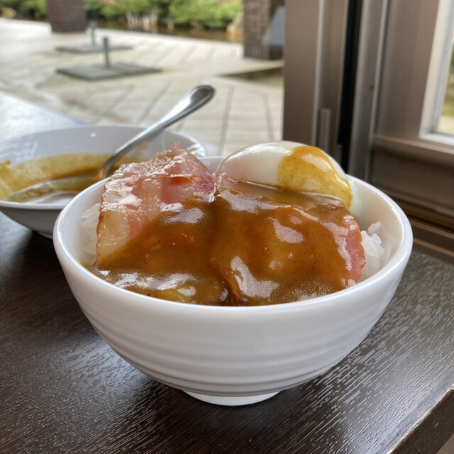 ご飯にベーコンと温玉をのせてカレーをかける。
