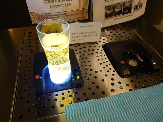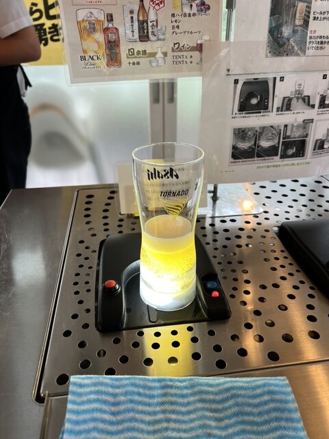 生ビールディスペンサーに専用ジョッキをセットすると自動的に底から螺旋状にビールが注入される。注入中はライトで照らされとっても綺麗!