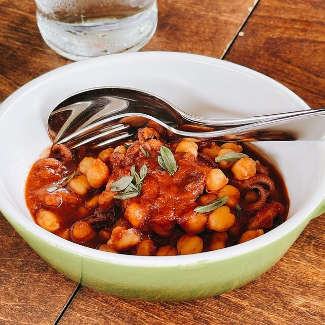 ○イイダコとひよこ豆のトマト煮込み。
