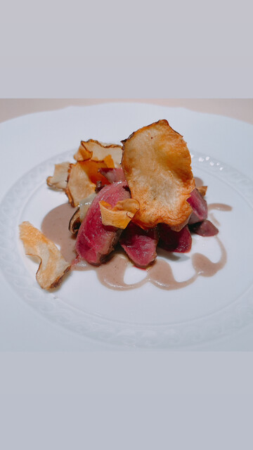 ○前菜。鴨肉 ラグサーノチーズ。