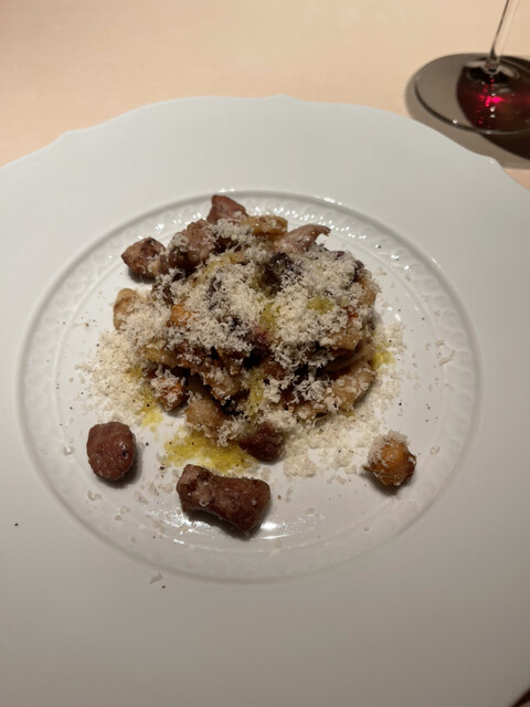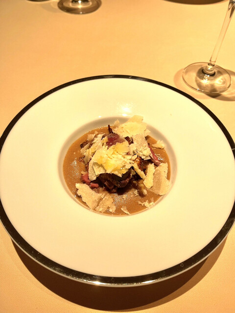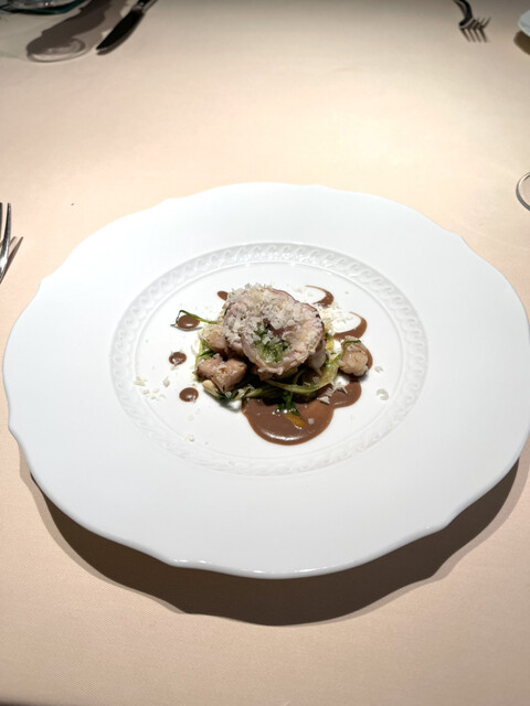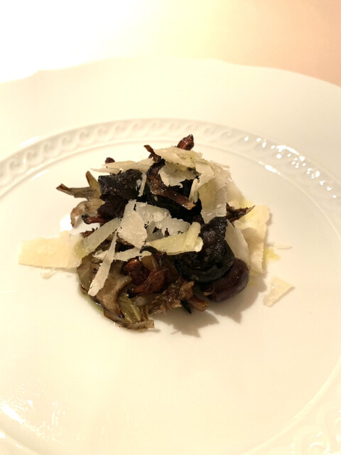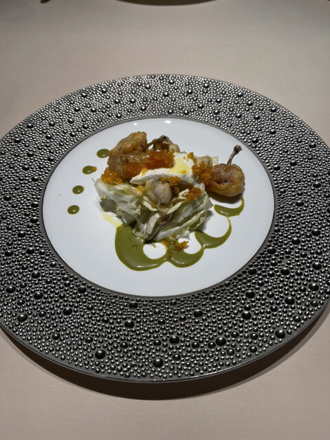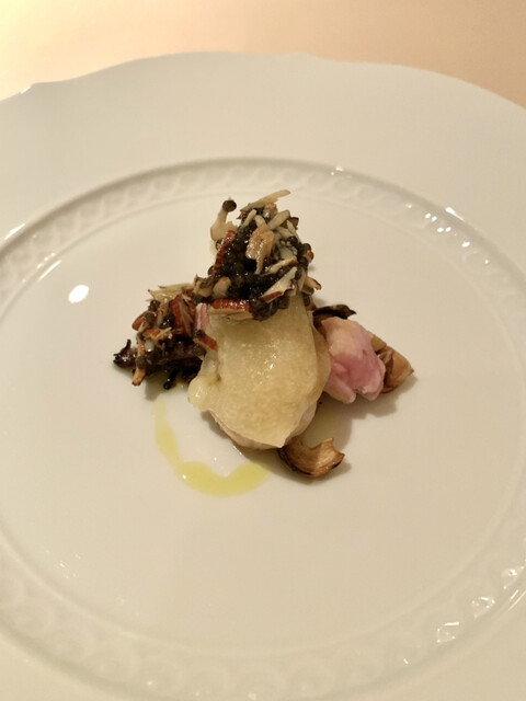 スカンピーニ、ほろほろ鳥、ポルチーニ黒キャベツ