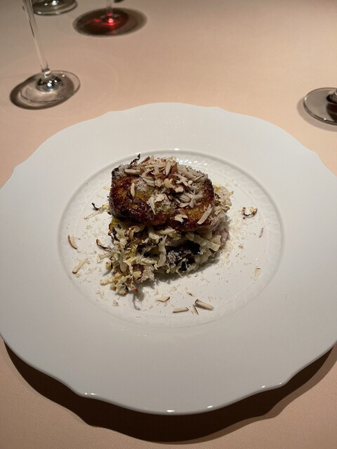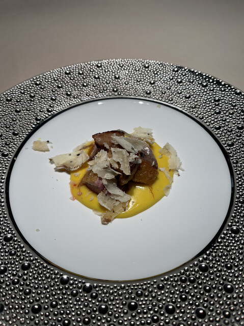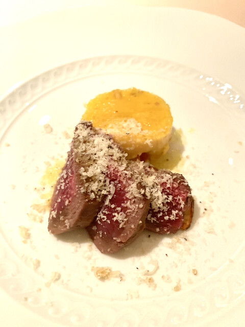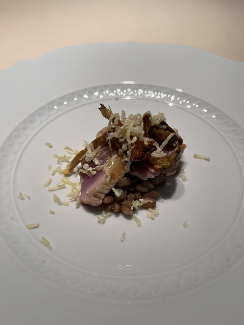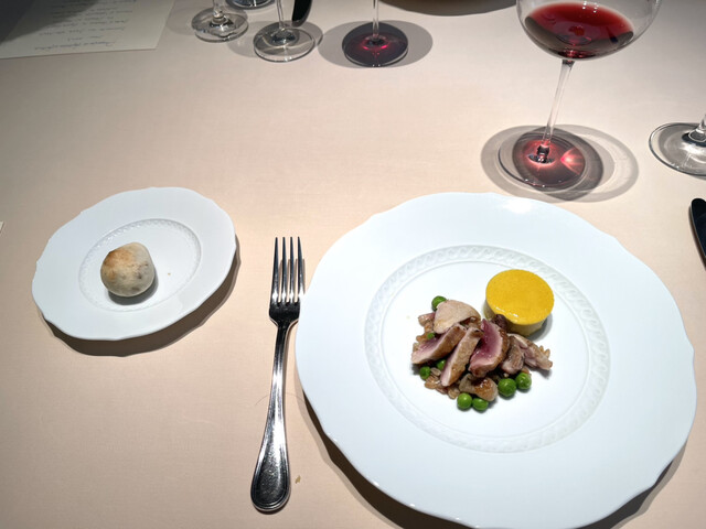 鴨の胸肉、フォアグラの前菜、ポレンタビアンカ