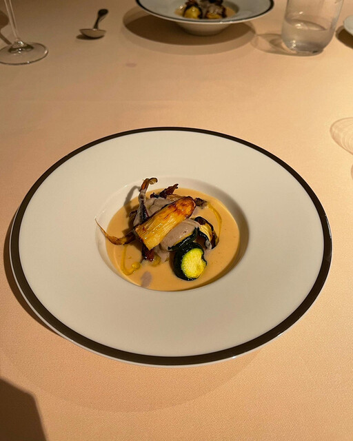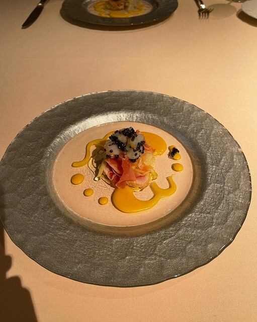 子ウサギの背肉、ノンプレスの生ハム、スカンピエビマンゴと胡椒のソース