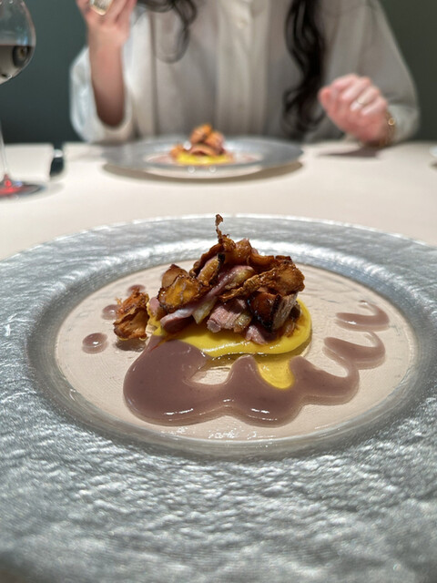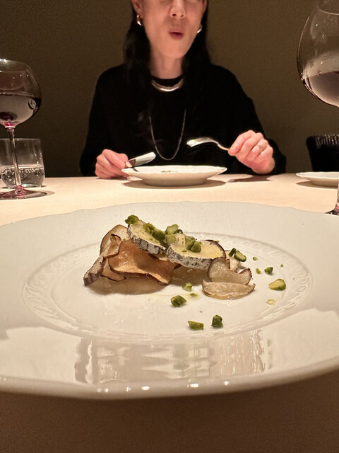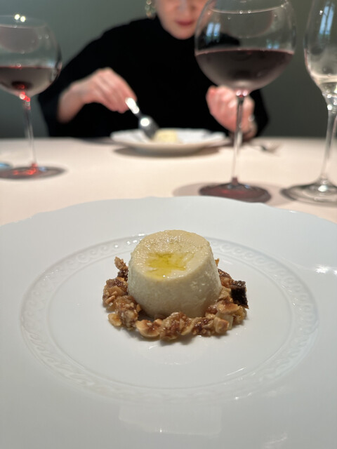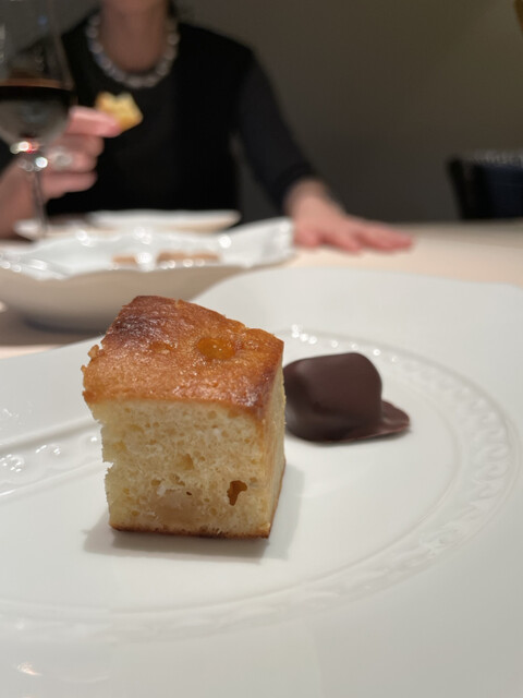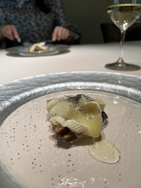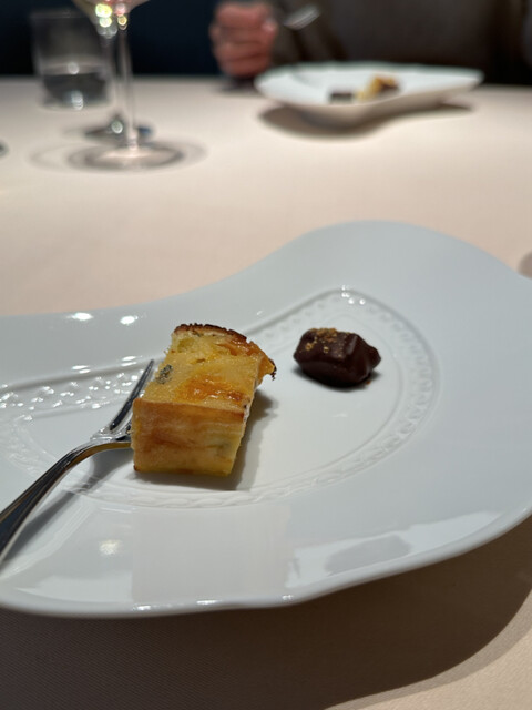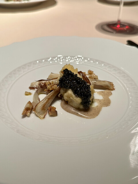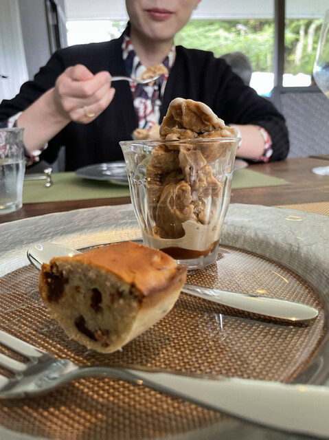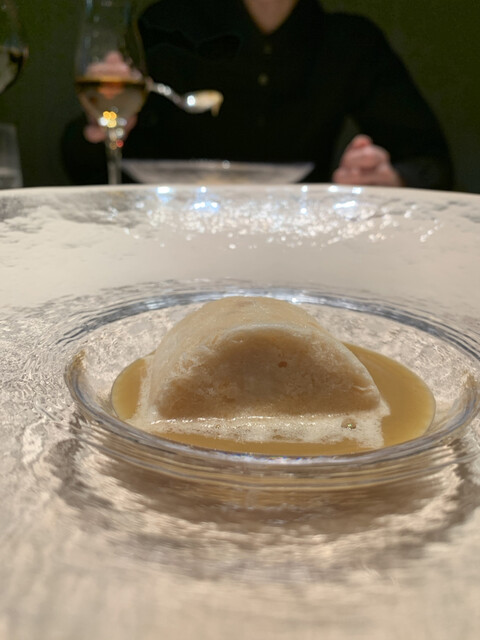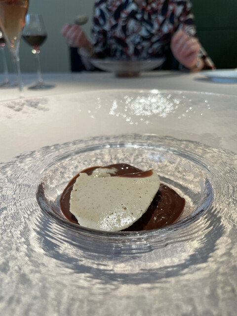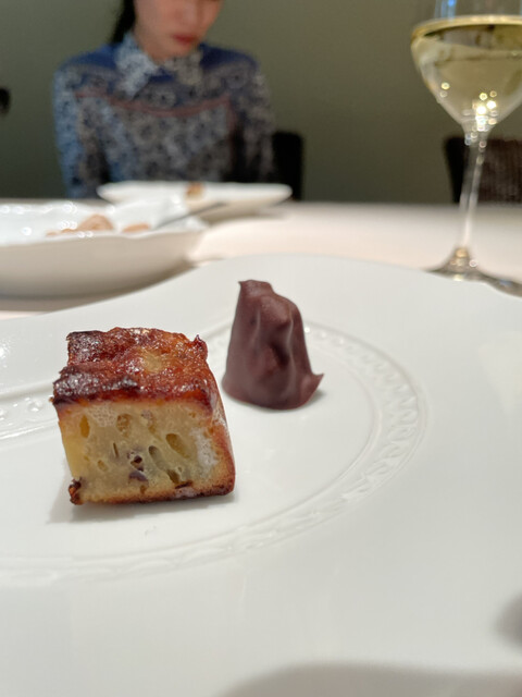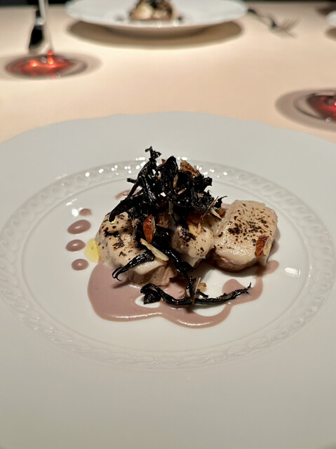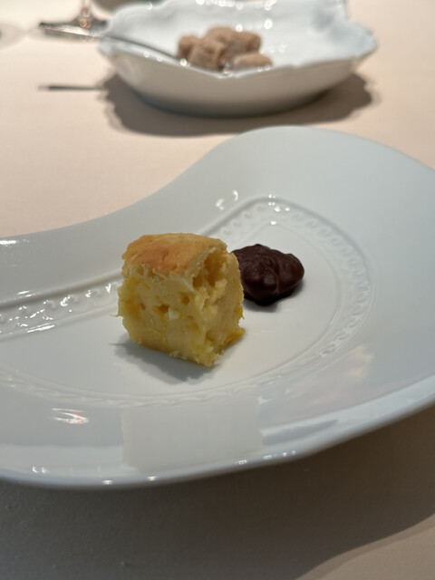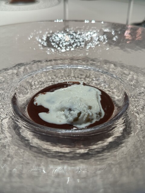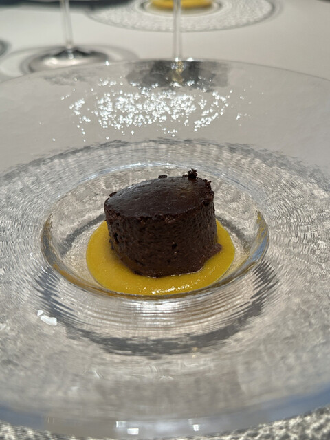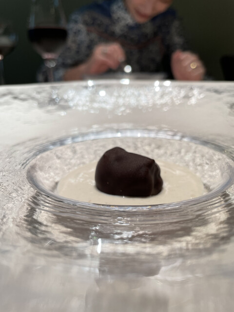 熱で溶けてたビターなチョコの中からから黒トリュフの香りがたちのぼり、ソースの栗の香りと見事に相乗し、大地感を持った深い深い美味しさに。