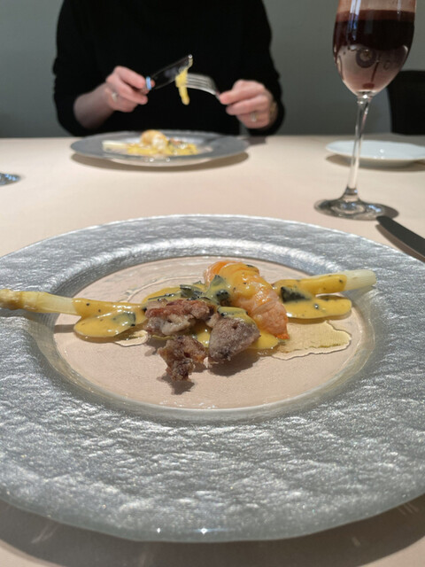 アスパラソバージュと手長海老が滑りで繋がり、