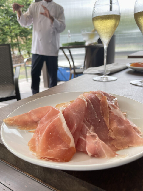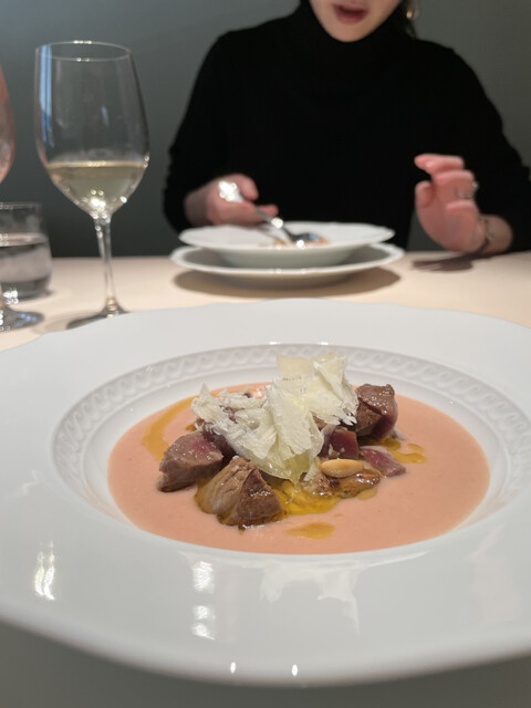 イタリア産の人参、生ハムの皮と合わせて煮込んだトスカーナの白インゲンを炒めて、ジビエの骨のスープと合わせて煮込み、パルメザンチーズと合わせてミキサーにかけて濾したスープ。
