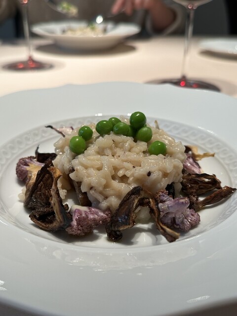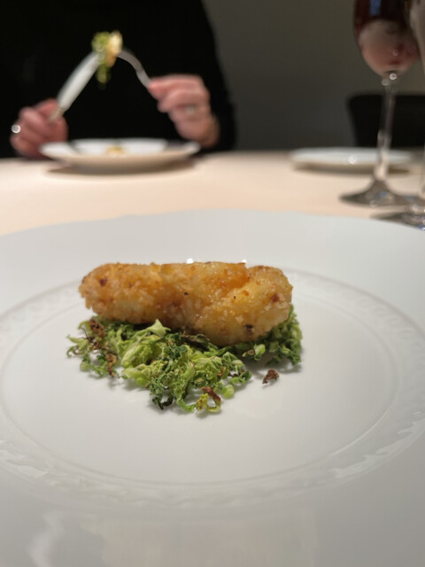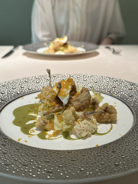 さっぱりしたカエルの旨味、衣とソースが引き立てる。ロマネスコはほろ苦さと旨味が濃く、下のサラダの瑞々しい苦味に、合わせたチーズのフレッシュな酸味と香りが見事に相乗して、味覚をグングン刺激!