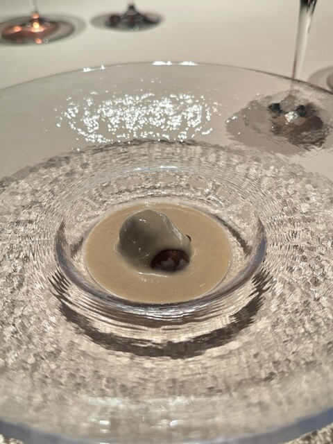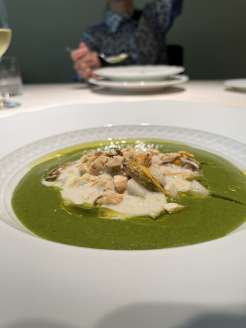 薄切りズッキーニとセージと炒めてムール貝のスープで煮込んで、ラスケーラチーズと合わせてミキサーにかけ、漉して冷やしたスープにムール貝とムスロン茸のローストを合わせて。